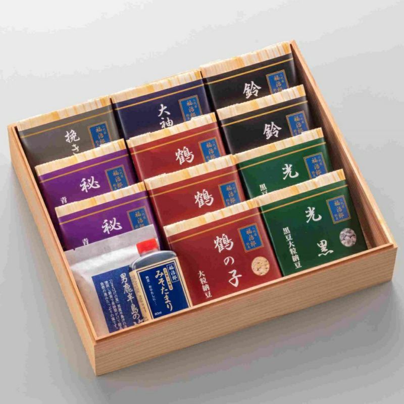 高級納豆秋田杉箱入り詰合せ (11袋入・ みそたまり45・ 男鹿半島の塩入り)