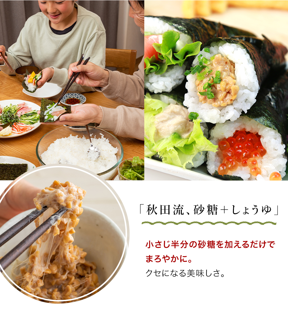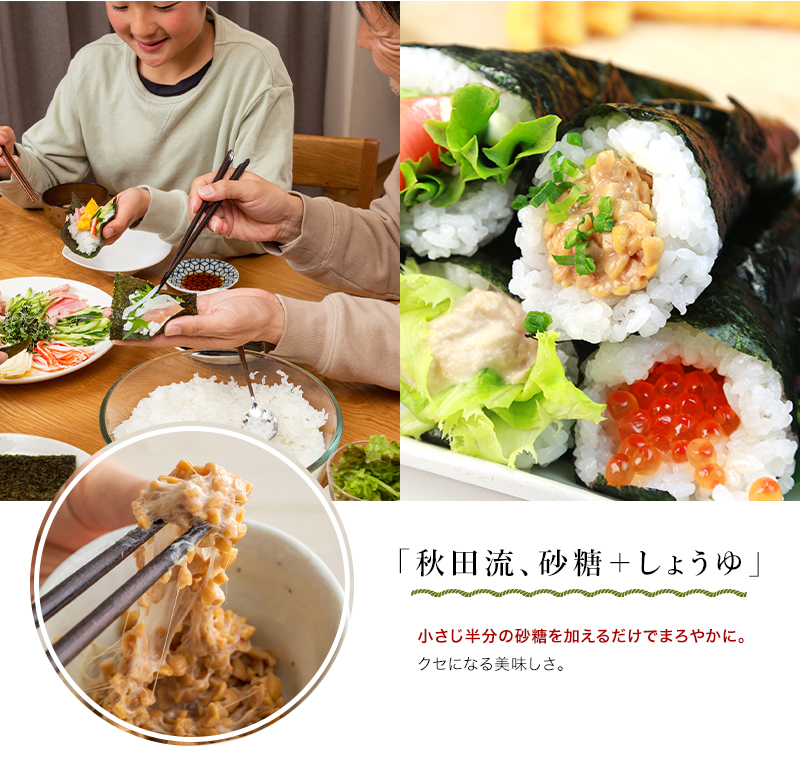 香りと粘りが強いひきわり納豆、おすすめは手巻き寿司。