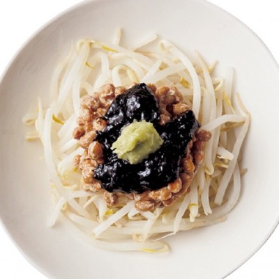 2. もやしの水けをきって器に盛る。納豆1パック、のりのつくだ煮小さじ2、練りわさび小さじ1/2を順にのせる。